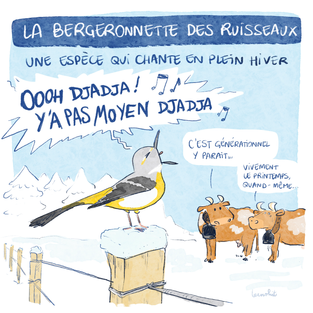 La bergeronnette est une espèce précoce qui chante en plein hiver. Sa première nichée peut être observée dans des bâtiments ou des cavités naturelles dès la fin avril. Cette ponte précoce lui permet d’élever une seconde couvée durant la même année. Elle se promène le long des rivières à la recherche d’insectes pour se nourrir, mais sans jamais plonger. Se mouiller les plumes, très peu pour elle !